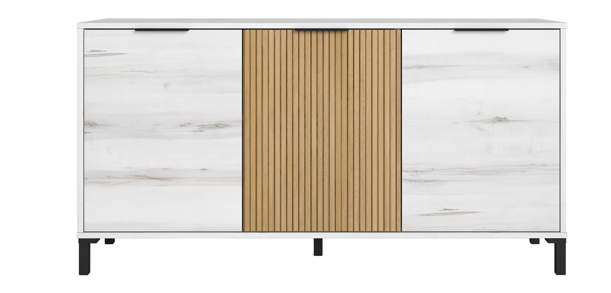 Aparador modelo Tokio, fabricado en melamina color Albo, combinado melamina efecto rayado. Incluye patas de PVC. Bisagras, bases de bisagras y tiradores de metal.